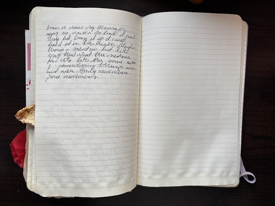 I reread this page on the same day, three years later. This page is the last entry I wrote. To be honest, there are about fifteen blank pages left. But I remember feeling the need to shed this diary and begin anew. The last sentences are, “It’s like the same, but remembering over and over. Body remembers, place remembers.”